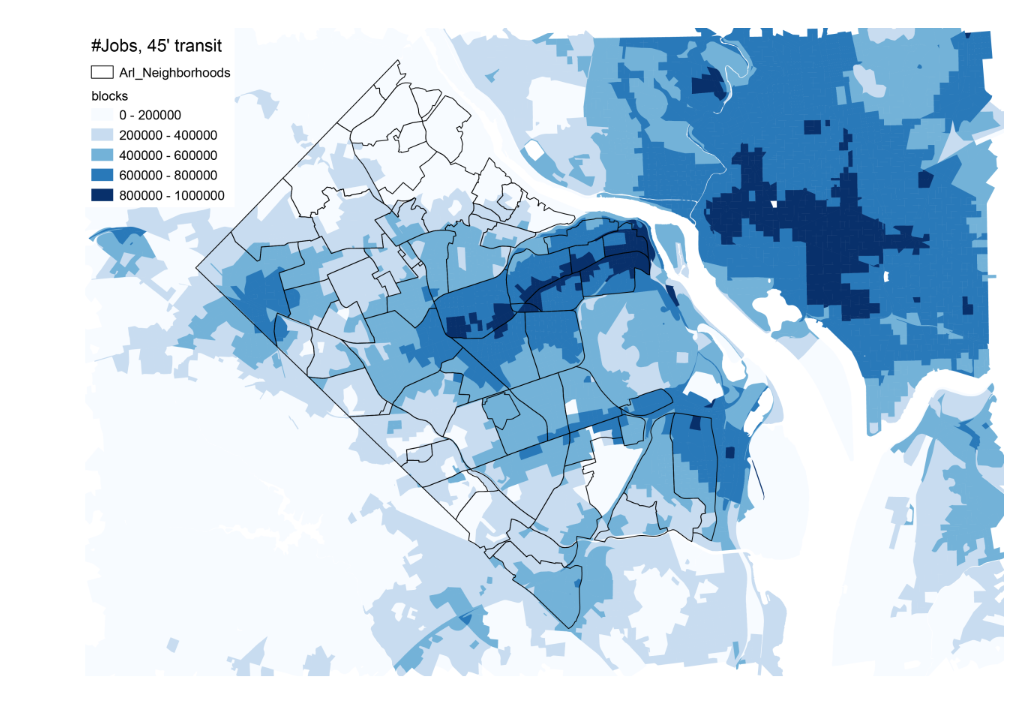 Looking at access to opportunity, we can count access to jobs as a useful way of seeing how much access different areas of Arlington and the region have. The Accessibility Observatory at the University of Minnesota does this kind of analysis for most major metropolitan areas in the US, including their most recent analysis of access to jobs by transit from 2019 for the Washington region. Taking their analysis and overlaying the access to jobs by transit in 45 minutes with Arlington neighborhoods, we can see the patterns of that access in the map below where darker shades of blue mean greater access to jobs by transit.